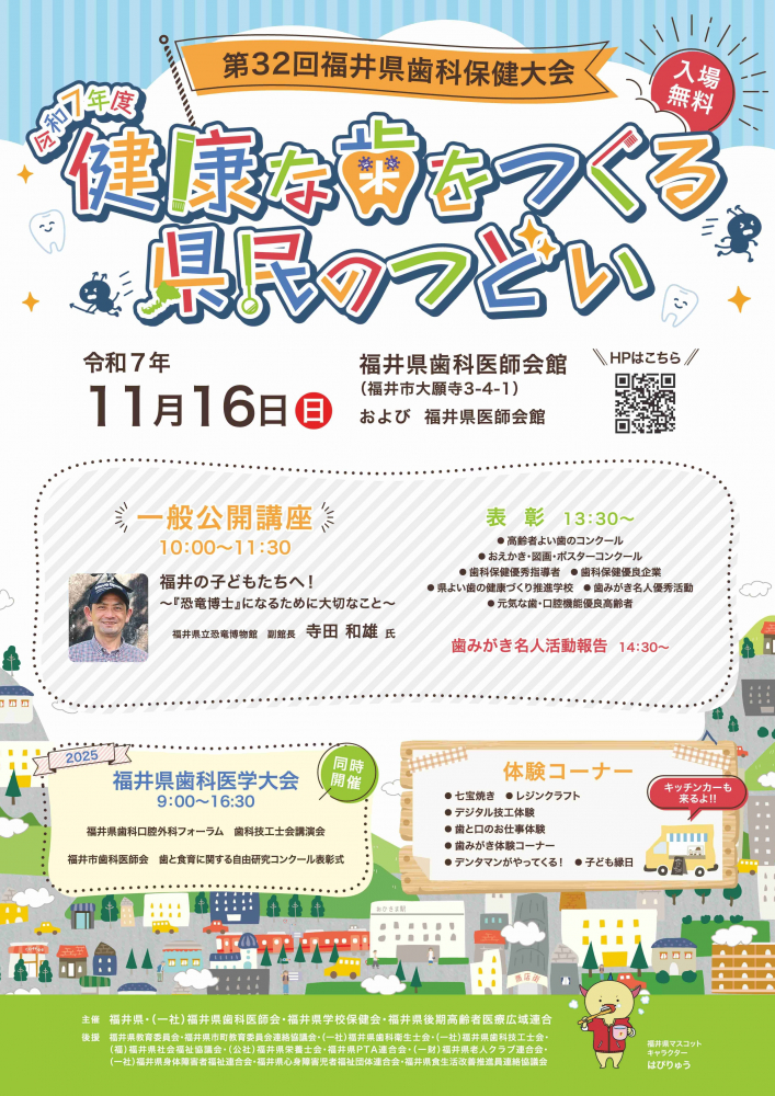 福井県立恐竜博物館の寺田副館長による一般公開講座や、歯のコンクールなどの表彰式を行います。同時開催の「福井県歯科医学大会」では、福井歯科専門学校による歯と口のお仕事体験や、歯科技工士会によるデジタル技工体験、歯科衛生士会によるレジンクラフトなど、歯に関する様々な体験コーナー(子ども縁日もあります!)を設置しており、どなたでも楽しめるイベントを実施します。